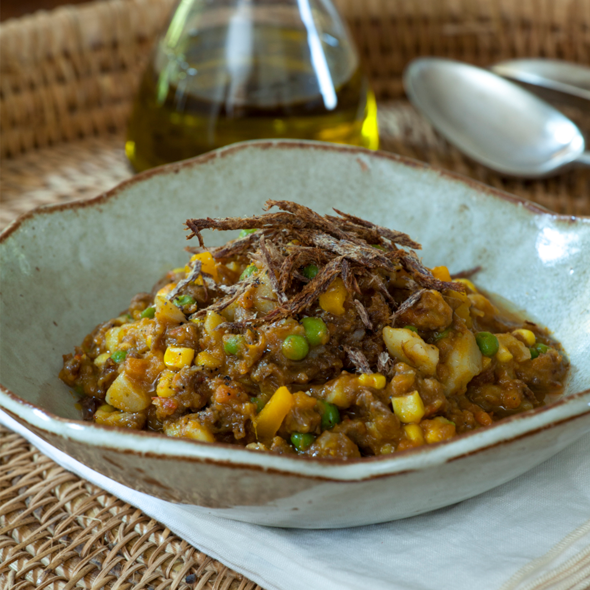 - Retire el recipiente Varoma y reserve. Vierta el charquicán en una fuente honda, agregue el choclo y las arvejas cocidas, mezcle todo en forma envolvente con la espátula. Sirva caliente.