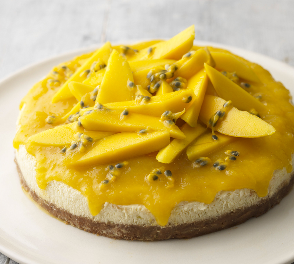 CHEESECAKE CON COBERTURA DE MANGO Y MARACUYÁ