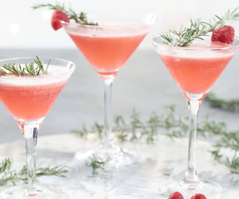- Añada el almíbar reservado, la ginebra y mezcle 10 seg/vel 5. Reparta la mezcla en los vasos y rellénelos con la tónica. Decore con las frambuesas y el romero y sirva.