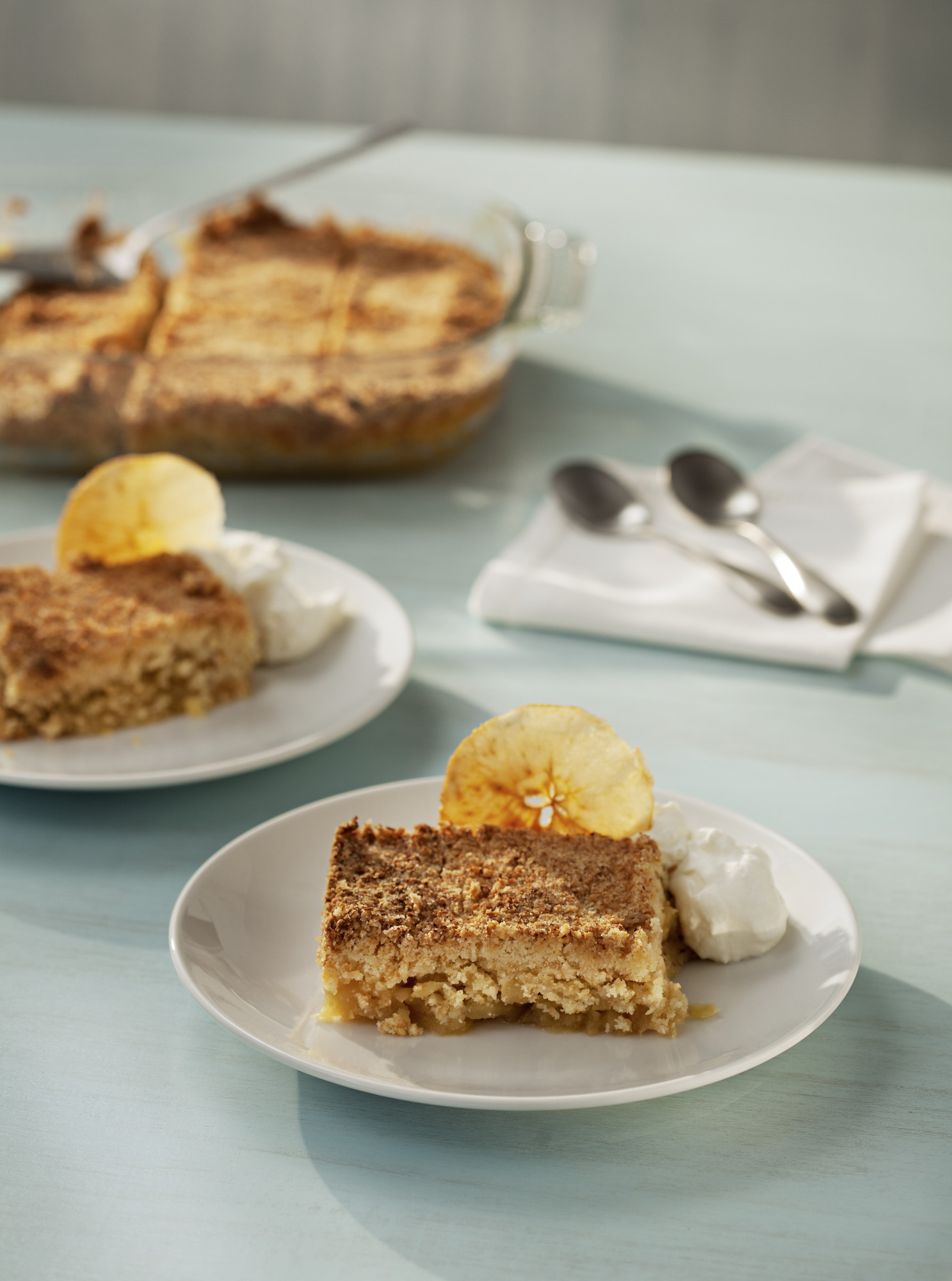 - Vierta por encima de las manzanas 100 g de agua, 150 g de azúcar y cubra con el crumble de coco.