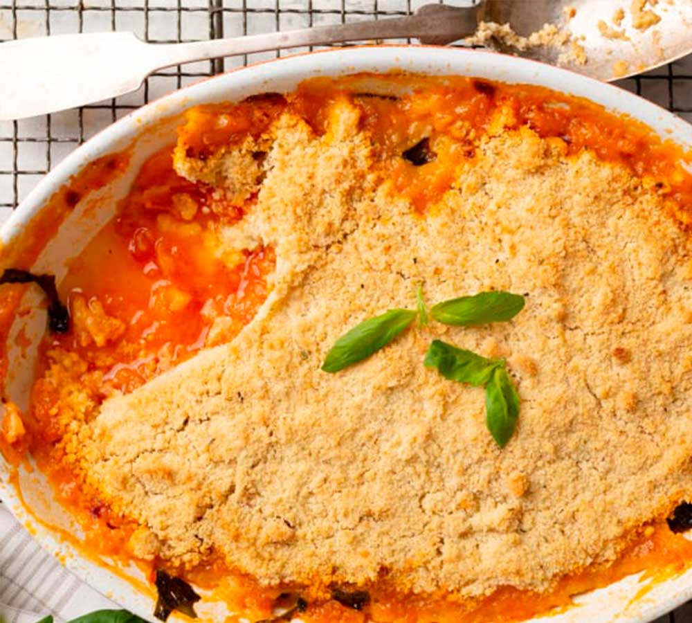 - Añada los tomates y trocee 4 seg/vel 4. Coloque el cestillo en lugar del cubilete y programe 10 min/Varoma/vel cuchara/vel 1. Ponga la preparación de tomates en una fuente de horno y espolvoree con la albahaca. Distribuya el crumble sobre la preparación de tomates y albahaca.