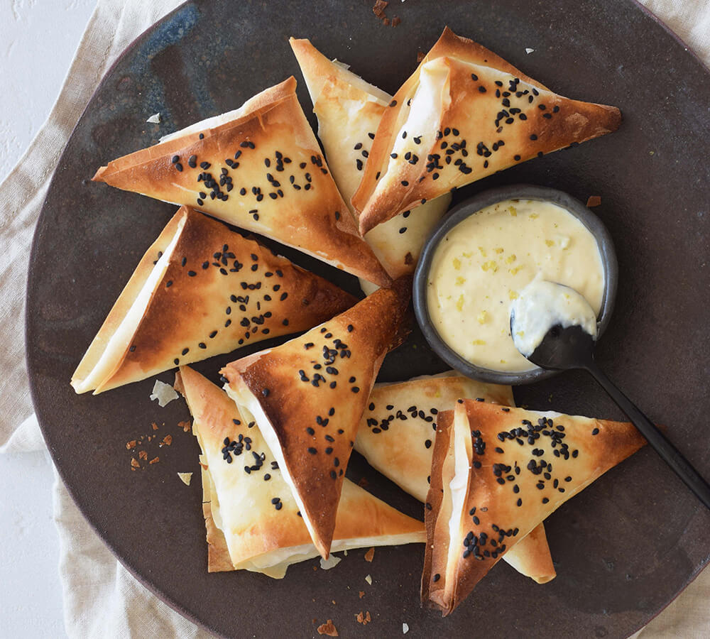 EMPANADITAS DE MASA FILO CON SALMÓN, CIBOULETTE Y SALSA DE RÁBANOS PICANTE