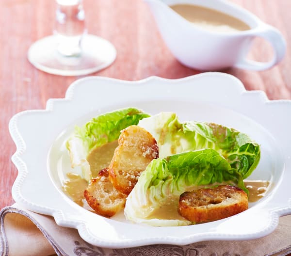 - Sirva un cama de lechuga con los crutones, vierta el aderezo y espolvoree con el resto del queso parmesano rallado.