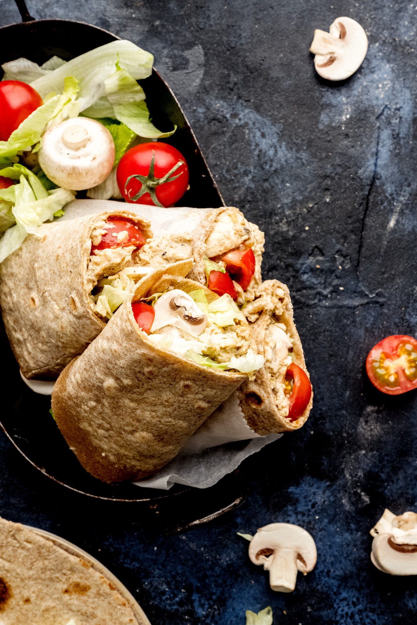 - Caliente 4 tortillas integrales y reparta el relleno, los tomates, los champiñones y la lechuga. Enrolle y sirva inmediatamente (ver sugerencia).