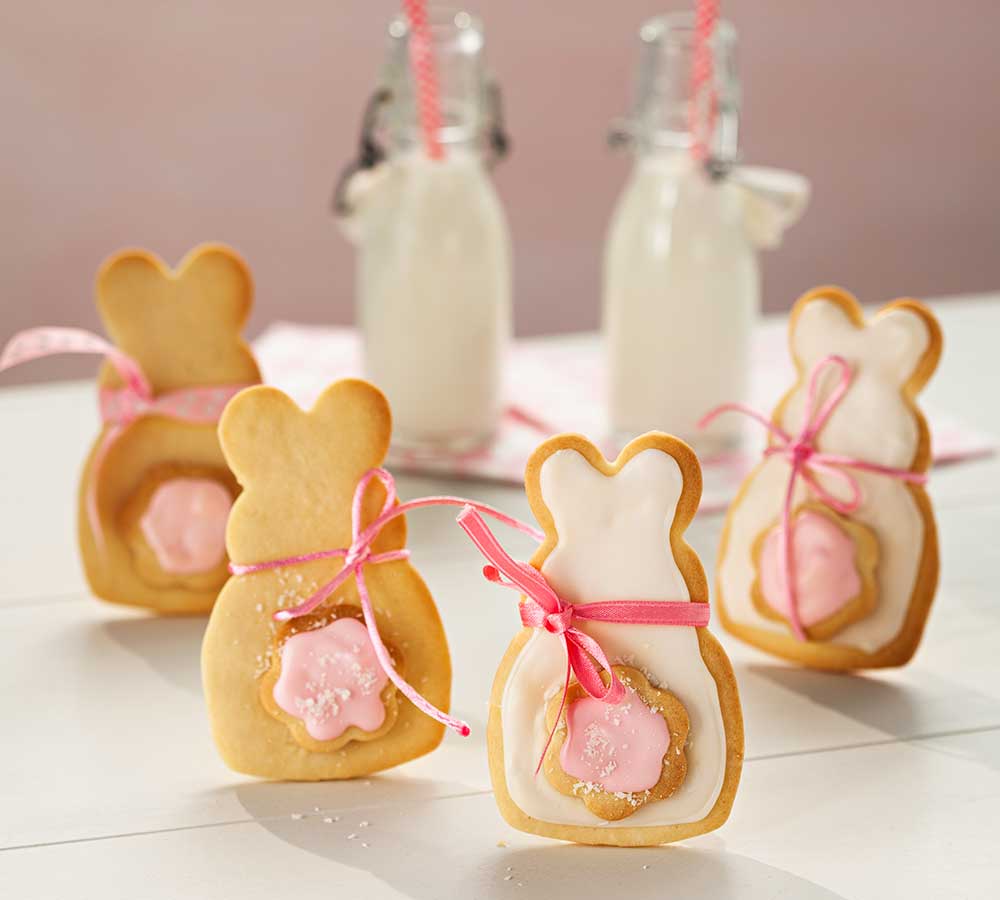 - Corte la masa con cortapastas de diferentes formas (conejo, pollito, huevo, etc.) y coloque en una de las bandejas reservadas.