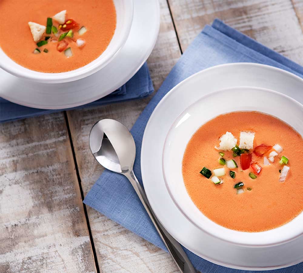 - Puede servir con dados de tomate, cebolla, pimiento, pepino y pan, presentados por separados.