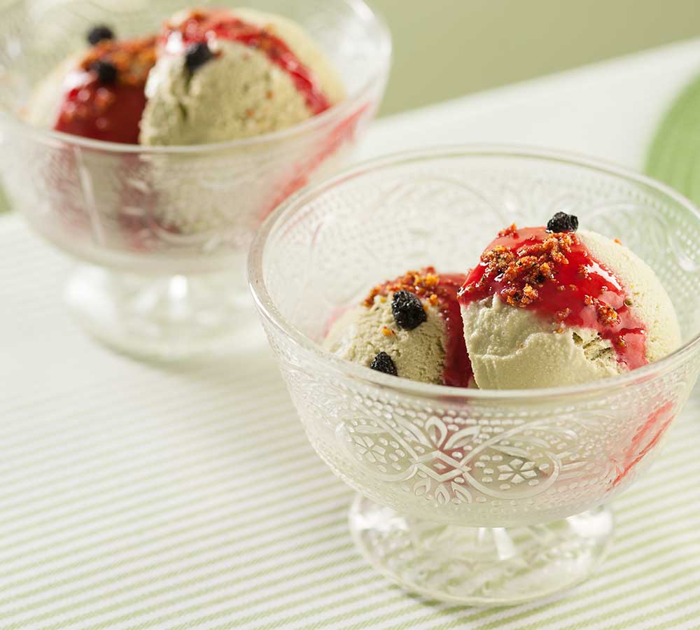 - Sirva el helado acompañado con la salsa de frambuesa y espolvoreado con el crujiente de pistachos.