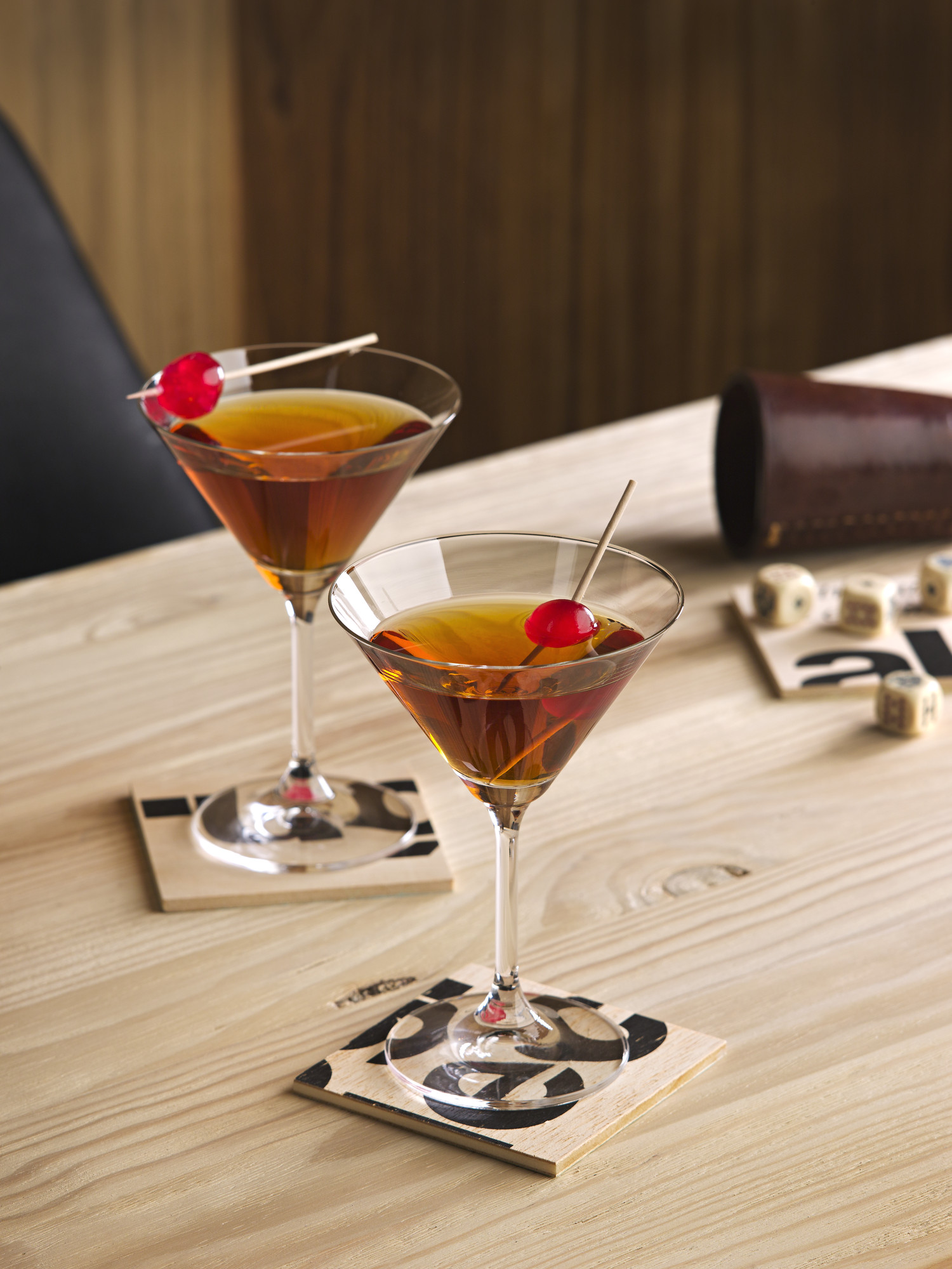 2. Decore cada copa con una guinda atravesada por un palillo y añada una gota de angostura. Sirva inmediatamente.