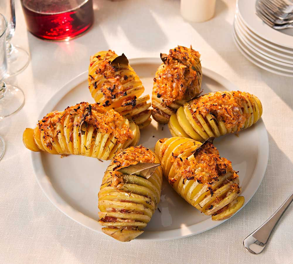 - Corte las patatas en rodajas colocándolas sobre una superficie cóncava (una cuchara grande) o poniendo un palillo chino tumbado a cada lado de la patata, de manera que al cortar las rodajas, la hoja del cuchillo tope y las rodajas queden unidas como las hojas de un libro al lomo. Introduzca trozos de tocino entre las rodajas de papa, ponga ½ hoja de laurel en cada papa (reserve el resto) y espolvoréelas con 1 cucharadita de romero. Colóquelas en el recipiente Varoma, tape y reserve.