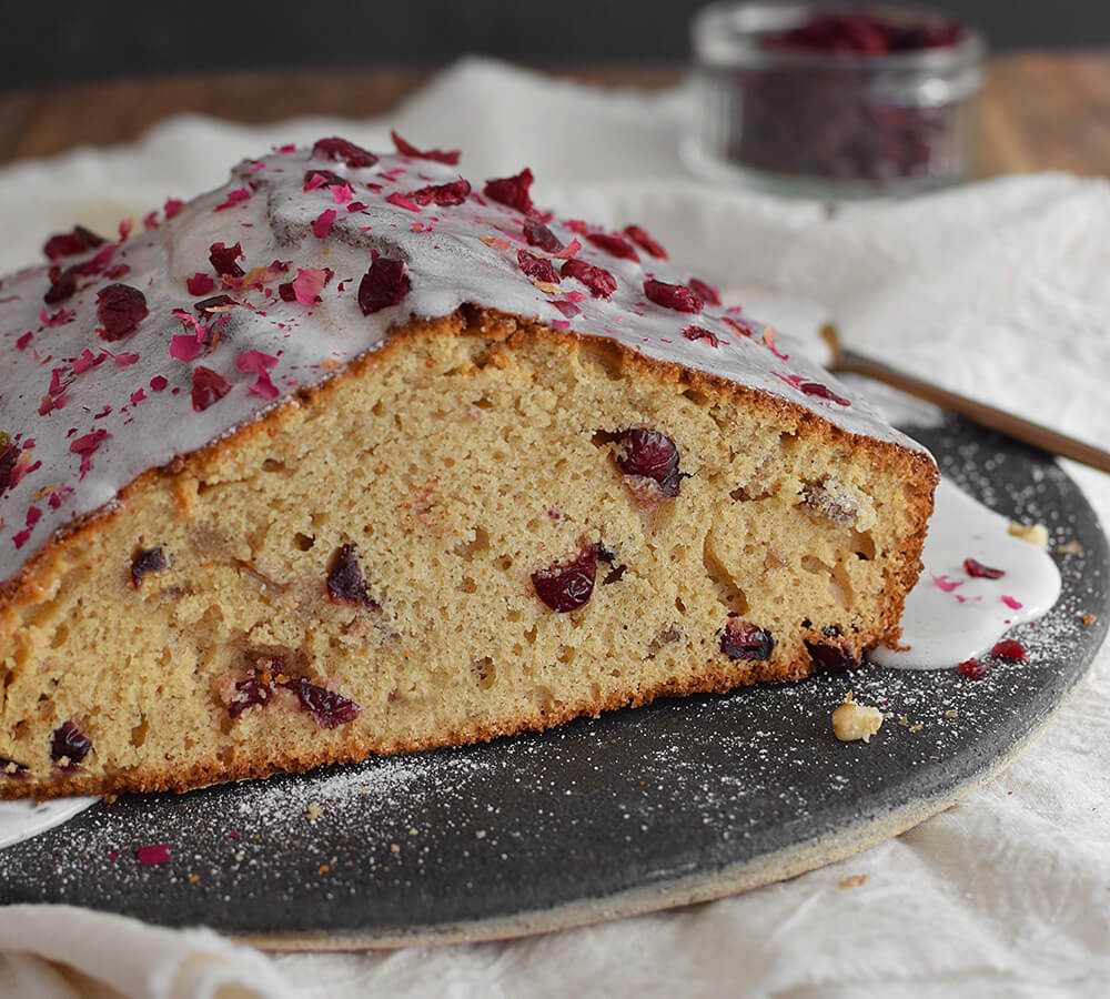 1. Sobre el queque frío, vierta el glaseado reservado de manera pareja, espolvoreé cranberries y los pétalos de rosas.