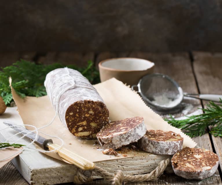 - Cuando esté frío, espolvoréelo con azúcar glas y vuelva a envolverlo con el film apretando con las manos para que el azúcar se pegue y haga el efecto de la piel del salchichón. Retire el film, corte en rodajas y sirva.