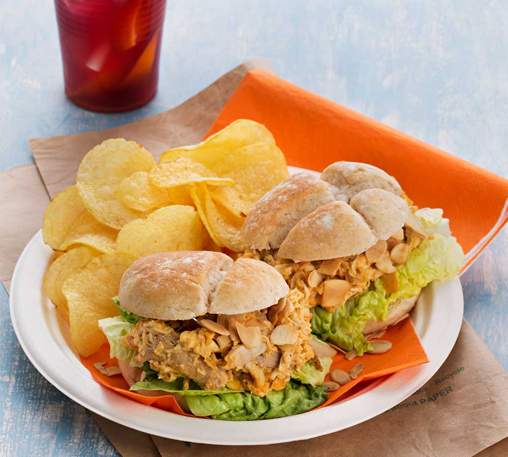 1. Coloque sobre la mitad inferior de los panes las hojas de lechuga y reparta encima el pollo. Espolvoree con las almendras y cubra con la otra mitad de los panes. Póngalos en una bandeja o plato de cartón, reparta alrededor las papas chips y sirva.