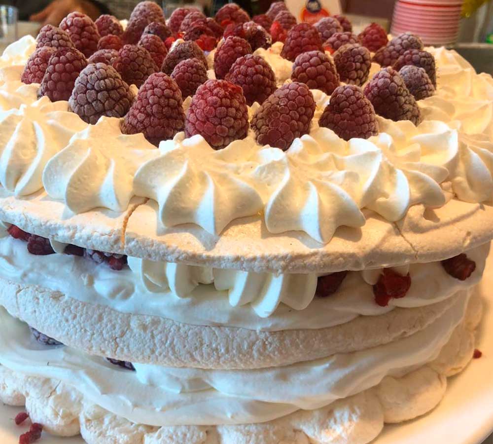 - Inserte la mariposa. Coloque la crema en el vaso y bata 1-3 min / velocidad 3, o hasta obtener la consistencia deseada, controlando cuidadosamente que no se pase el punto de la crema. Retire la mariposa y ponga la crema en una manga con boquilla. Rellene cada rodela de marengue y cubra con las frambuesas, luego ponga la otra rodela, mas crema batida y mas frambuesas, asi hasta llegar a la tercera rodela.