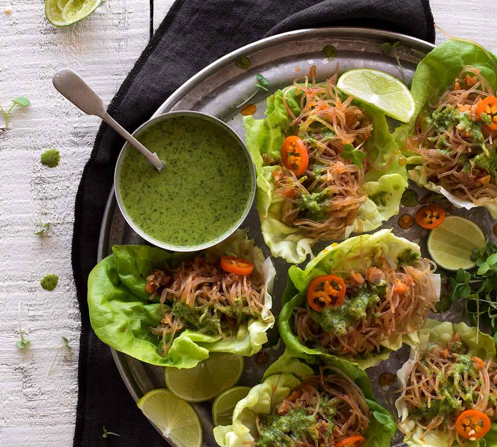 WRAPS DE LECHUGA RELLENOS CON FIDEOS DE ARROZ ESTILO THAI